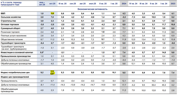 В среду, 3 декабря, был опубликован большой блок статистики по российской экономике за октябрь. Рост ВВП в октябре составил 1,6% (г/г) vs. 0,9% месяцем ранее. Рост индекса потребительских цен с 25 ноября по 1 декабря составил 0,04%, а с начала года — 5,27%. В годовом выражении инфляция опустилась до 6,61%.
