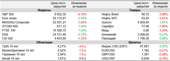 Ведущие мировые фондовые индексы не показали единой динамики на прошлой неделе, при этом американский Dow Jones заметно вырос и впервые в истории преодолел отметку 50 000 пунктов. Торги вновь проходили очень волатильно, а лидерами снижения в Штатах в очередной раз стали акции техкомпаний, прежде всего производителей ПО. Инвесторы опасаются, что быстрое развитие инструментов ИИ приведет к существенному падению спроса на продукты и услуги таких компаний и сделает неактуальными их текущие бизнес-модели. Кроме того, участники торгов с тревогой восприняли новость о том, что суммарные капзатраты четырех представителей бигтеха — Amazon, Google, Meta (признана экстремистской и запрещена в РФ) и Microsoft — в этом году достигнут внушительных $650 млрд, при отсутствии четких перспектив окупаемости данных инвестиций. Дополнительное давление на акции оказывали неоднозначные макроданные, указавшие, в частности, на сохраняющиеся сложности на американском рынке труда. И хотя в пятницу в Штатах произошел мощный отскок в технологическом секторе, S&P 500 и Nasdaq так и не удалось выйти в плюс по итогам недели. Отметим также, что определенную поддержку европейским фондовым рынкам оказали результаты заседаний ЕЦБ и Банка Англии, хотя они в целом были в рамках ожиданий. На наступившей неделе участники торгов будут ждать январских отчетов по занятости и инфляции в США за январь, которые могут скорректировать ожидания по дальнейшей траектории монетарной политики в стране. Кроме того, инвесторы продолжать изучать многочисленные корпоративные отчетности, а также будут анализировать выступления представителей Федрезерва и следить за результатами нескольких крупных IPO.