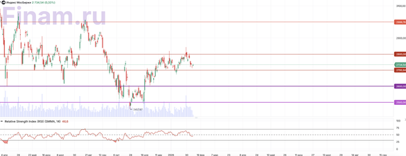 Индекс МосБиржи на дневном графике, как мы и ожидали вчера, совершил технический отскок. Импульс является слабым, но дает надежду на то, что приближение к нижней границе бокового канала 2700 — 2800 не реализуется. Ожидаем возвращения котировок к середине канала на значения 2750 до заседания Центробанка. В случае негативного исхода значение 2700, вероятно, будет достигнуто.