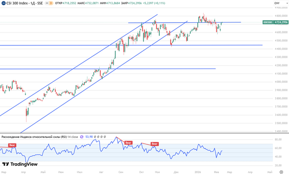 Китайский индекс CSI300 на дневном графике сегодня окончательно устаканился в боковом канале 4450 — 4730. Рынок продолжает отскакивать после недавнего сильного падения, геополитический фон также помогает индексу приблизиться к линии сопротивления 4730 п., в случае пробоя вверх индекс может наконец выйти из бокового движения.