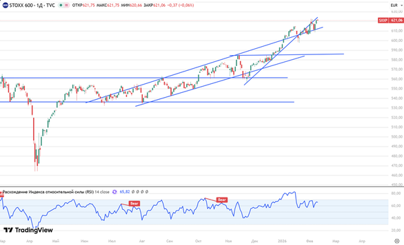 Европейский индекс STOXX600 окончательно выше из растущего канала, однако верхняя граница канала стала новой границей более быстрого растущего тренда. Если в ближайшие сессии индекс не вернется в растущий канал, его верхняя граница окончательно станет новой линией тренда. На рынке присутствует небольшая перегретость (RSI = 67 п.).