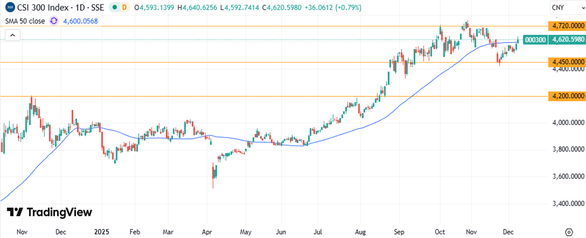 На дневном графике CSI 300 похожая картина – индекс отскочил от нижней границы локального горизонтального канала 4450-4720 пунктов и тестирует на предмет пробития 50-дневную скользящую среднюю. В случае успеха целью дальнейшего повышения станет верхняя граница фигуры.
