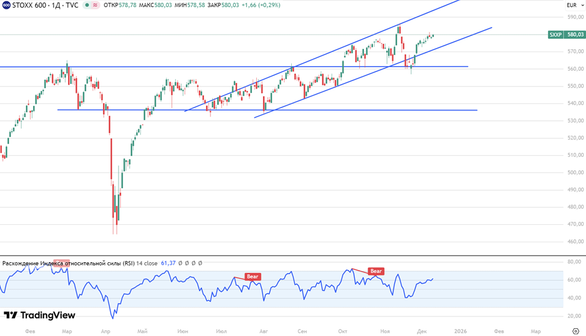Европейский индекс STOXX600 продолжает находиться в многомесячном восходящем тренде, вернувшись в него после недавнего роста. Текущая ситуация выглядит как попытка закрепиться около исторического максимума. Однако, уже есть признаки перегрева, показатель RSI = 62, что говорит о средней перекупленности на рынке. Возможна короткая коррекция до нижней границы восходящего канала, до значений порядка 570-572.