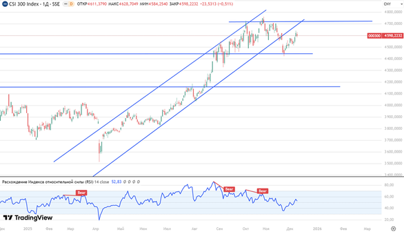 CSI 300 показывает негативную динамику из-за публикации слабых макроэкономических данных: индекс деловой активности в промышленности (PMI) вновь опустился до отметки 49,9, что сигнализирует о замедлении производственного сектора. Это усиливает сомнения инвесторов в темпах восстановления внутреннего спроса и оказывает давление на акции промышленного и сырьевого сегментов, которые чувствительны к циклическим колебаниям экономики.