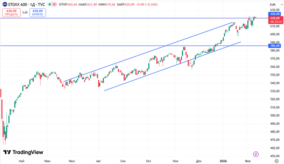 Индекс STOXX 600 торгуется вблизи уровня сопротивления в районе 620 пунктов. В случае сохранения позитивного новостного фона рынок может предпринять попытку пробоя данного уровня.