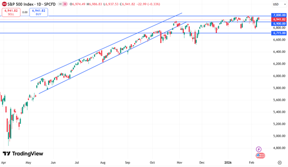 Индекс S&P 500 торгуется на уровне 6941,8 пункта. В случае ухудшения рыночного фона не исключена коррекция с возвратом индекса в диапазон 6715 – 6900 пунктов. При сохранении позитивной рыночной динамики индекс может продолжить рост и протестировать новый уровень сопротивления 7000 пунктов.